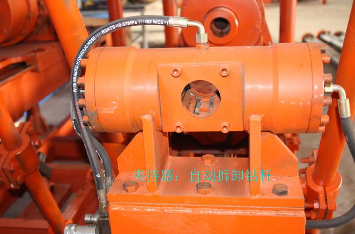 旋转系统、夹紧系统、推进系统全部液压控制,自动上、卸钻杆,减轻了操作工人的劳动强度。夹紧卡盘、变速箱系统一体化设计,夹紧油缸外置,卡紧力大,便于拆装维修。推进油缸采用双出头油缸设计,具有推进行程长的特点,推进行程可达到880mm。液压系统采用双泵供油回路系统,推进、旋转互不影响。油泵、马达、操作阀等核心部件均采用可靠厂家。钻孔倾角在 ±90°范围内可调,钻孔300米完全没问题。