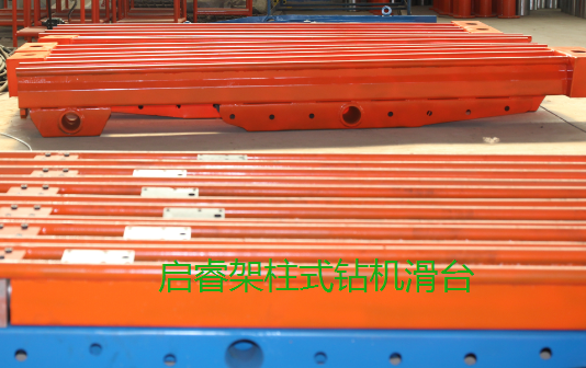 架柱式探水钻机以顶紧立柱作为支撑结构,立柱是钻机工作中的重要的承载部件。大扭矩钻机立柱采用双立柱结构,其稳定性、承载强度更高。立柱通过调整丝杠可以使钻机牢固的固定,锁紧套可以调整钻孔的高度和方向。无论气动架柱式钻机,还是液压架柱式钻机,都是回转动力式的。链接钻杆的动力机头在导轨上回,转钻进,承载动力机头的导轨总采用焊接形式,结构简单牢固可靠,导轨可承受着行走过程的进给力和回转过程的扭矩。