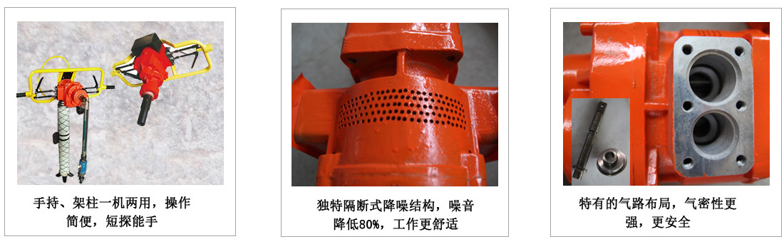 用途:ZQSJ-140/4.1气动手持式钻机是靠架柱克服钻机的重量和工作当中产生的反扭矩。该钻机为便携式,它具有安全防爆、转矩大、带有反转、转速高、质量小、效率高、结构简单、维修方便等特点。因此本钻机工作效率高、支护质量好、工人劳动强度低、进尺费用少,所以它是煤矿行业必备设备之一。该机主要用在探测地质构造煤层、探放水、瓦斯、煤层注水、卸放压力孔,巷道帮锚杆孔的钻孔及描杆的搅拌和螺母的安装。也可用于岩巷树脂锚杆的搅拌及螺母的安装。